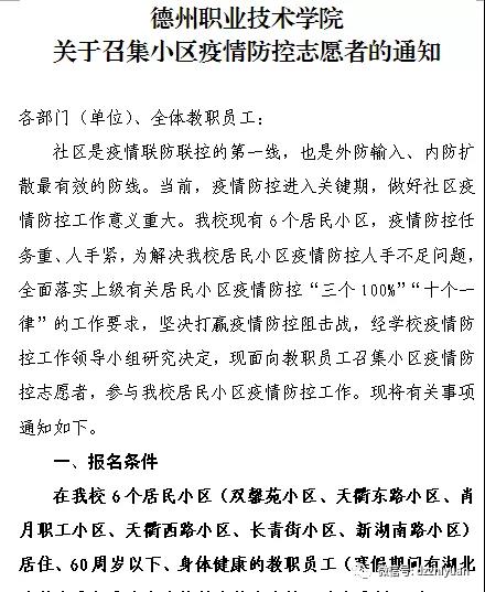 2月12日,德州市文明办官方微信刊发了《德州职业技术学院:构建联防联控全员战“疫”》,介绍了学校抗击新冠病毒肺炎的措施和经验。同日,德州市公安局国保支队支队长冉凡星、政委王拥政、副支队长刘强一行来学校检查指导疫情防控工作,并对学校疫情防控工作给予高度评价。这是学校提高政治站位,落实以师生为中心的发展理念,进一步完善防控新冠病毒肺炎工作体系的结果,为广大师生织密了“保障网”,维护了师生的生命和健康安全。
