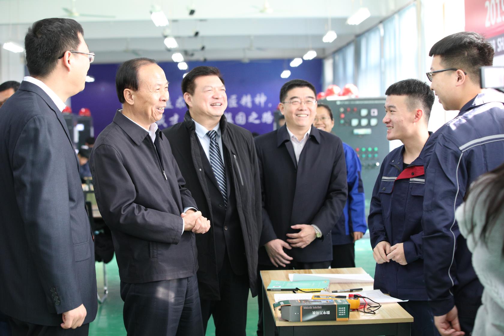 辅导报告结束后,陈勇在赵艺丁、樊兆杰等领导同志的陪同下,到我校电气工程系实训室考察,与师生亲切交流,调研学习宣传贯彻落实党的十九届四中全会精神情况、建议,了解学生的学习生活情况,鼓励学生学好理论和技能,积极参加体育锻炼和文体活动,成长为高素质技术技能人才。