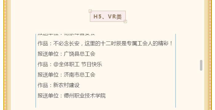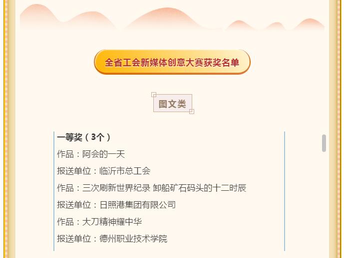 在新媒体创意的比赛中,全省共投稿600多件作品,我校的两件作品在众多作品中脱颖而出,由教师段文珺、张静、刘涛制作《大刀精神耀中华》获得新媒体创意大赛图文类一等奖;张宇、戴娜等教师制作《新农村建设》获得新媒体创意大赛H5、VR类二等奖,展示出了我校教职工良好的精神面貌和较高的专业技术水平。
