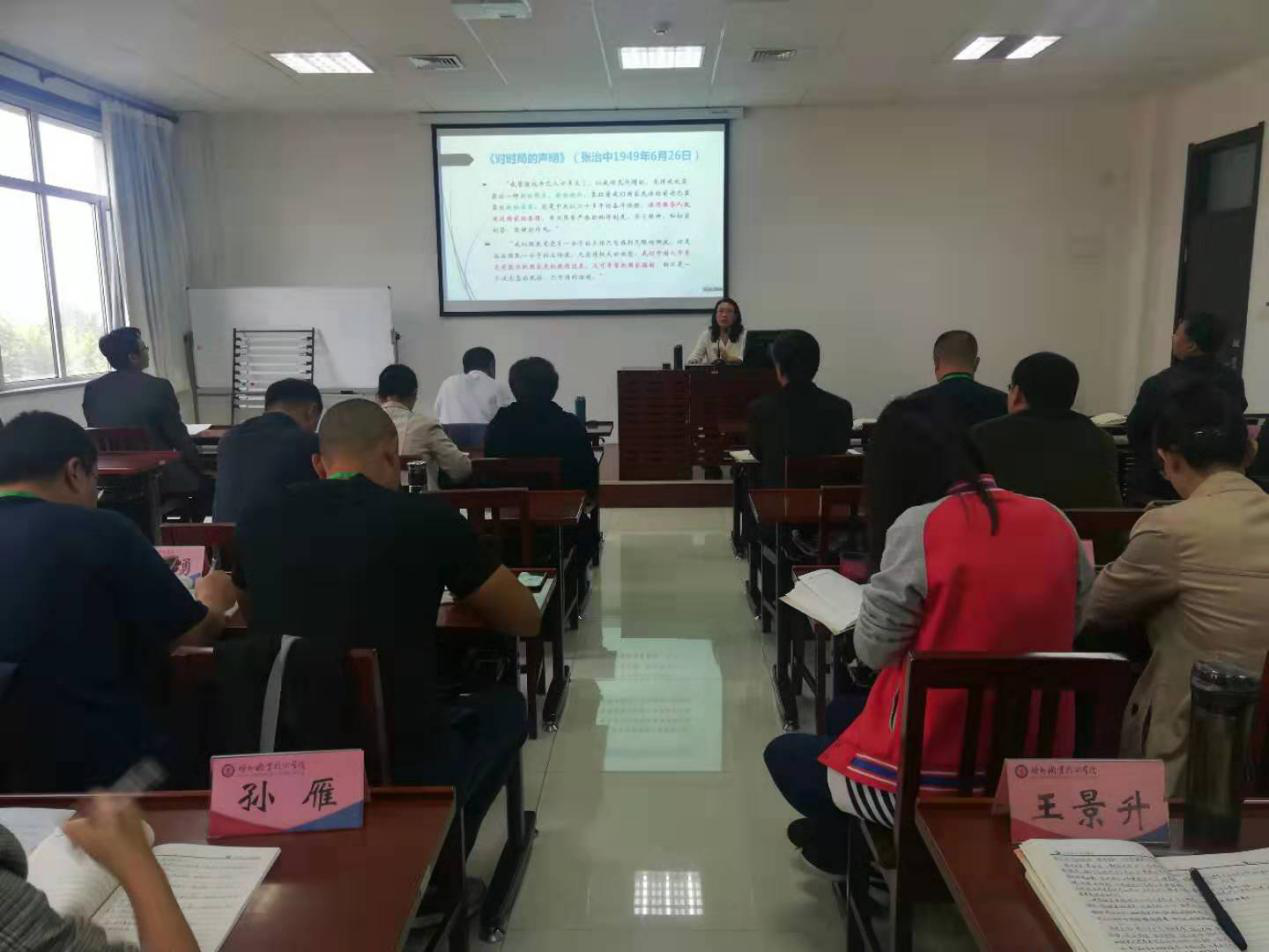 按照日程安排,10月10日上午邀请中共德州市委党校科学社会主义教研部副主任许兰菊教授,作形势与政策专题辅导讲座。许兰菊教授围绕“不忘初心、牢记使命,实现中华民族伟大复兴的中国梦”这个主题,用生动的语言,为大家讲述了中国近代史、中国共产党发展史,使我们更加坚定道路自信、理论自信、制度自信、文化自信。用大量的历史资料、理论观点和现实案例,深入浅出地阐释了开展这次主题教育的重大意义、根本任务和方法步骤。