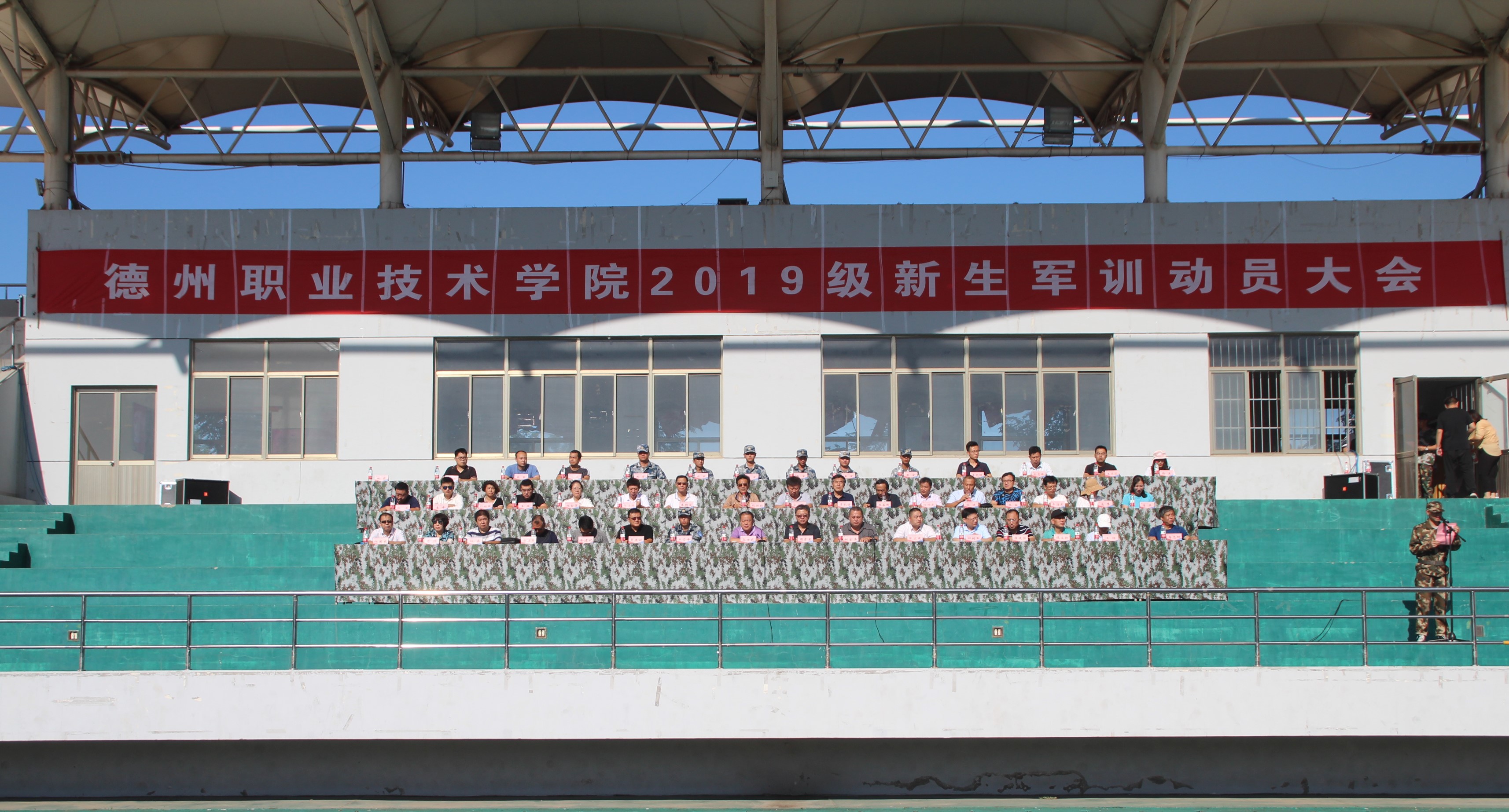 8月31日,德州职院2019级新生迎来开学第一课—军事训练。上午八时,2019级新生军训动员大会在校田径运动场召开。校党委委员、办公室主任郭士武,党委委员、宣传部部长周吉星,某部队队长尹雪峰,学校相关部门负责人出席,5000余新生参加动员大会。学生处(武装部)处长(部长)刘宏杰主持。