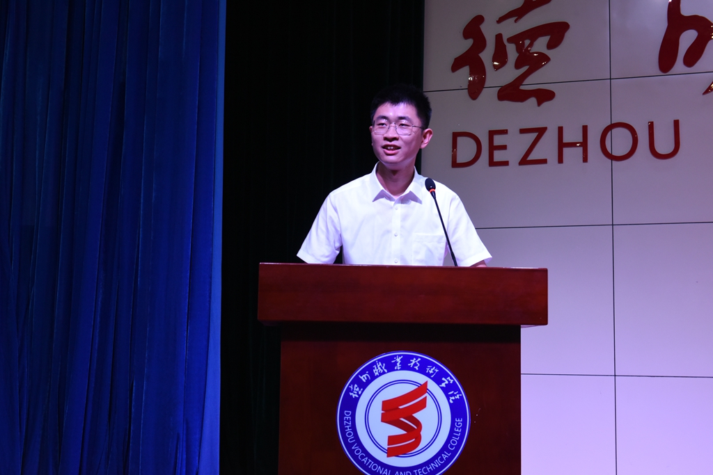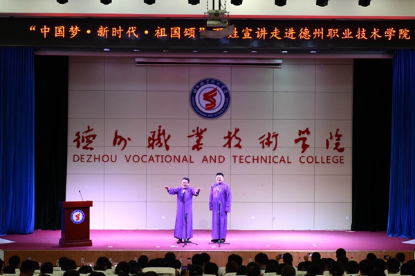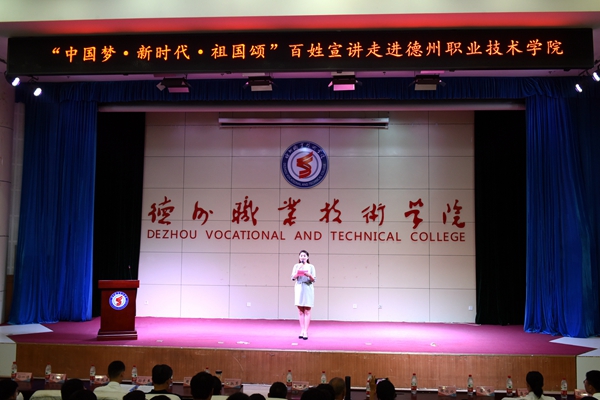 9月5日,以德州市委讲师团副团长郑淑芹带队的德州市“中国梦 新时代 祖国颂”百姓巡回宣讲团走进德州职业技术学院,为师生带来了精彩的宣讲。校党委委员、宣传部部长周吉星热情接待了宣讲团一行。来自我校及德州学院、山东华宇工学院的400余名学生聆听宣讲。