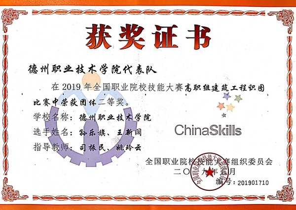 5月10日至12日,2019年全国职业院校技能大赛高职组“建筑工程识图”赛项在天津城市建设管理职业技术学院举行,来自全国31个省、自治区、直辖市的105所职业院校共210名选手参加比赛。由我校2017级工程造价专业学生孙乐旗、王新阔组成的山东四队,在指导教师司振民、姚玲云的带领下,沉着冷静,稳定发挥,荣获国赛银牌。