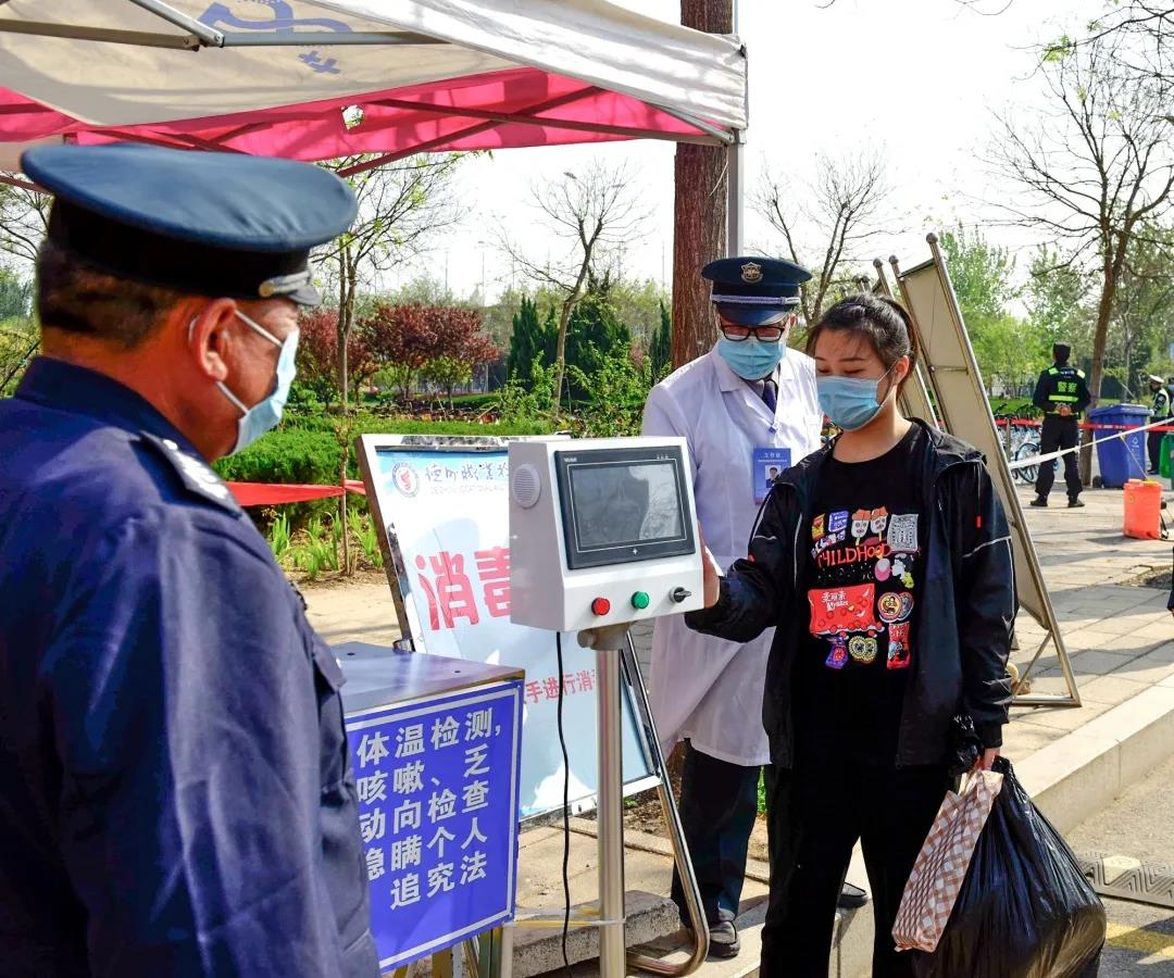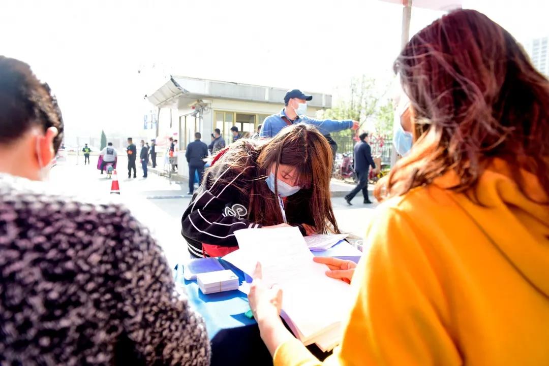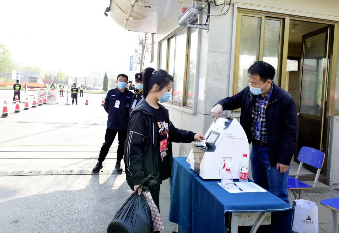 第一站,工作人员引导学生入校,进行体温测试和信息核验登记。