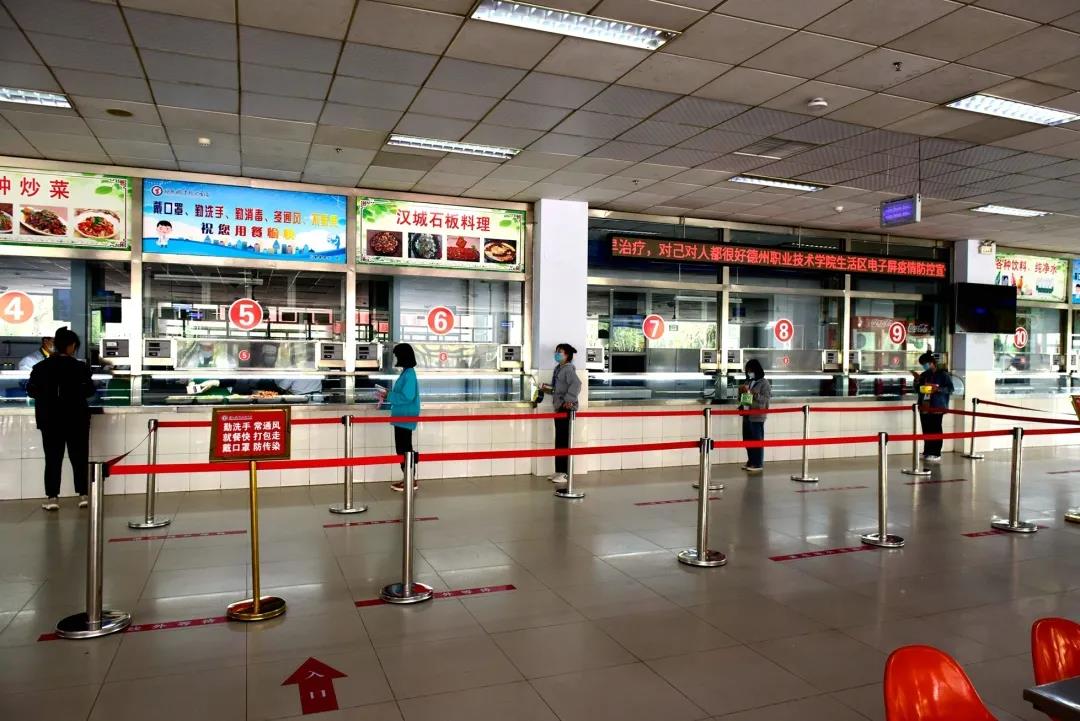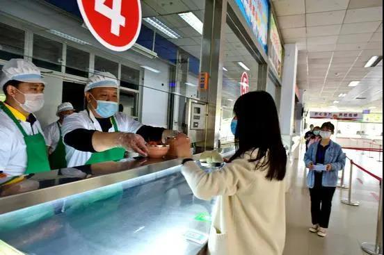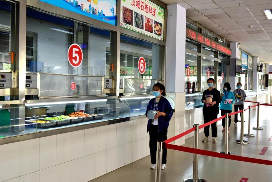 学生进入食堂,消毒、排队,保持间隔就餐。