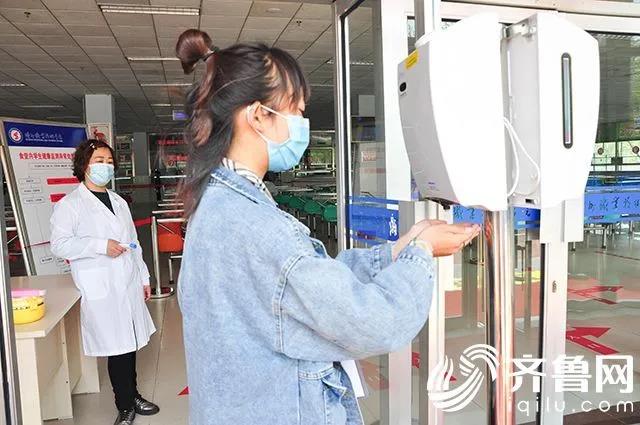 工作人员引导学生在学校自主研发的智能测温器前,对学生进行体温测试和消毒。