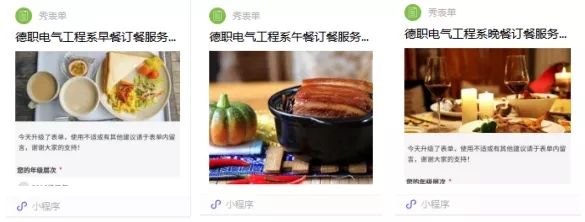 “网上餐厅”系统全名为“德职电气工程系订餐服务系统”,分为早餐、午餐和晚餐3个小程序,由教师李克强依托微信平台开发。每一个小程序设年级、班级、姓名、饭菜名称栏、联系电话、好的建议等7个栏目,同时发布通知提醒同学们早餐、午餐、晚餐的开单、结单时间和领餐的地点,并根据建议和实际情况不断对小程序进行改进。截至6月1日下午18时,该系统已经为2000余名学生提供了服务。