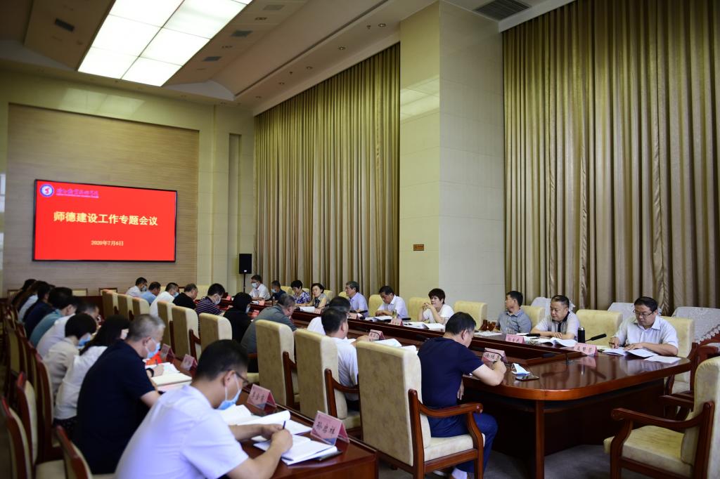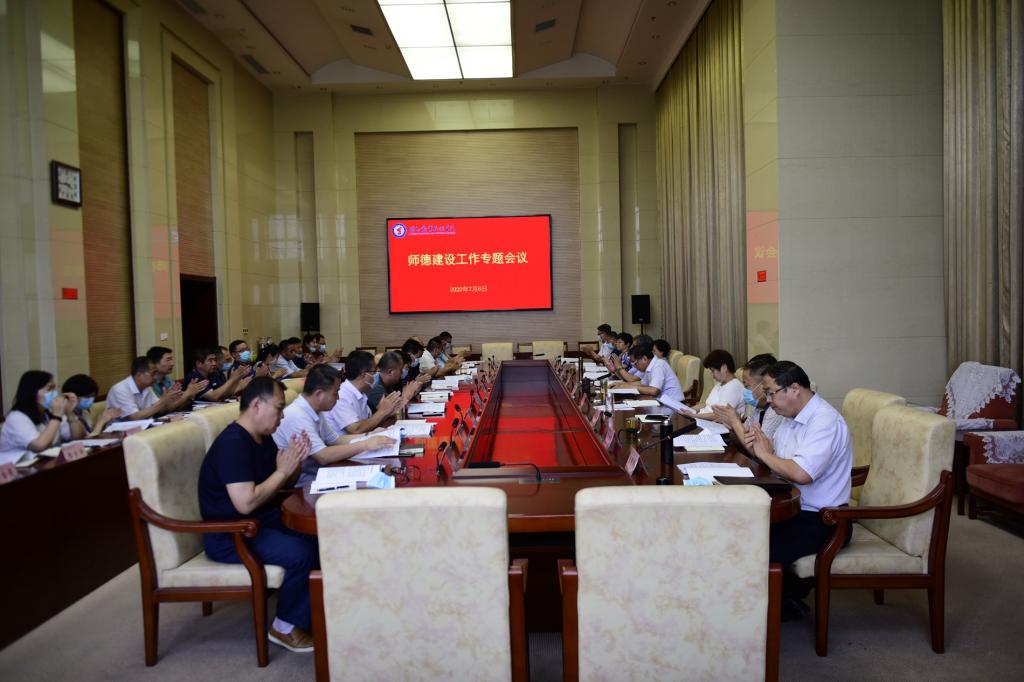 孟繁营传达了《山东省教育厅关于印发〈2020年加强师德师风建设十大行动计划〉的通知》等文件精神,解读了学校2020年师德建设主题教育活动的内容和要求。