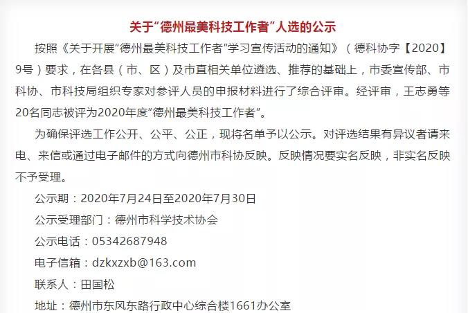 2020年“德州最美科技工作者”评选活动,由市委宣传部、市科协、市科技局举办,经各县(市、区)及市直相关单位遴选、推荐、专家评审等环节,共评选20名“德州最美科技工作者”。