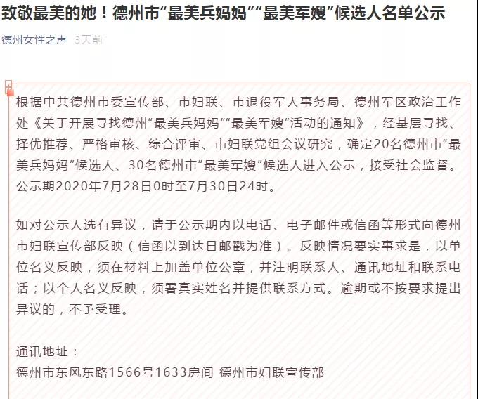 日前,中共德州市委宣传部、市妇联、市退役军人事务局、德州军区政治工作处开展了“寻找德州‘最美兵妈妈’‘最美军嫂’活动”。经基层寻找、择优推荐、严格审核、综合评审、市妇联党组会议研究,确定20名德州市“最美兵妈妈”候选人、30名德州市“最美军嫂”候选人。