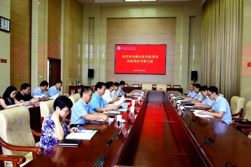 8月28日,潍坊医学院副院长葛国文一行4人来我校考察交流。校党委书记樊兆杰,市卫健委党组书记、主任常树风,市人民医院党委书记程吉东、院长杨宝贵,校领导陈章侠、张苹、殷淑英陪同。