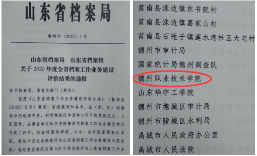 日前,山东省档案局印发《关于2020年度全省档案工作业务建设评价结果的通报》(鲁档字〔2021〕1号),德州职业技术学院被评为2020年度山东省档案工作业务建设先进单位。