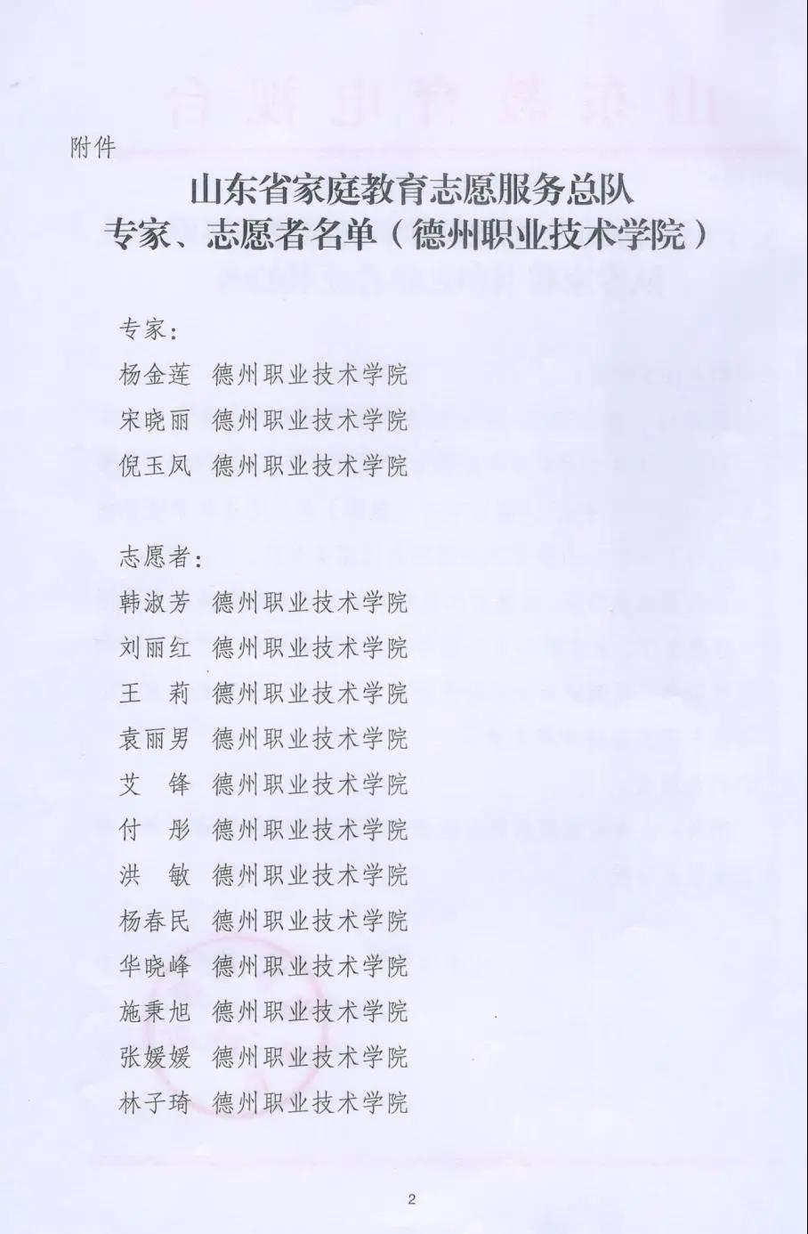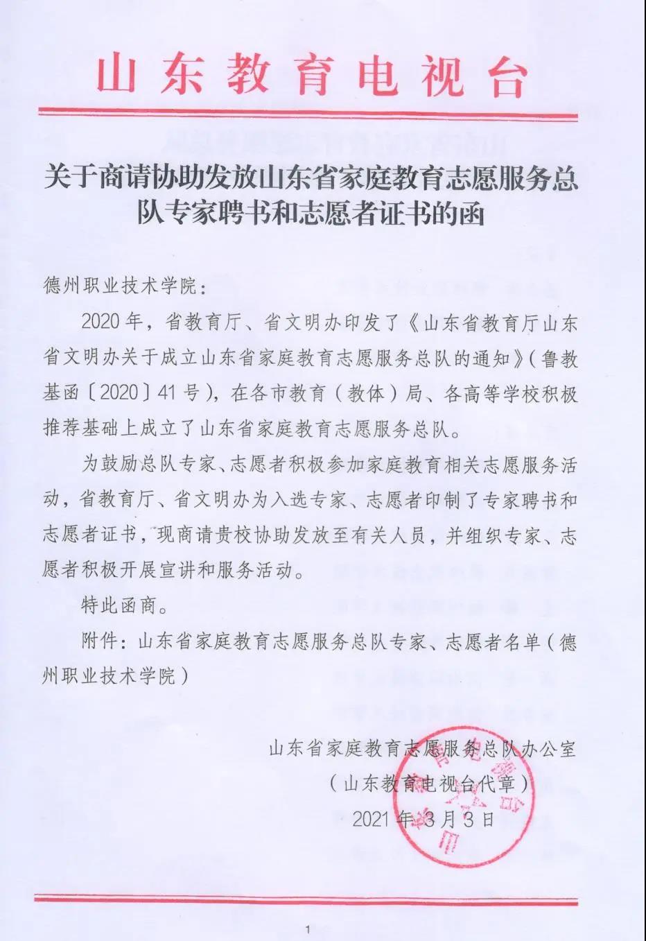 近日,山东省教育厅、山东省文明办寄发了《关于商请协助发放山东省家庭教育志愿服务总队专家聘书和志愿者证书的函》,公布了山东省家庭教育宣讲团和志愿服务总队成员的名单,我校杨金莲、宋晓丽、倪玉凤3位教师入选家庭教育宣讲团专家,韩淑芳等13位教师入选志愿者。
