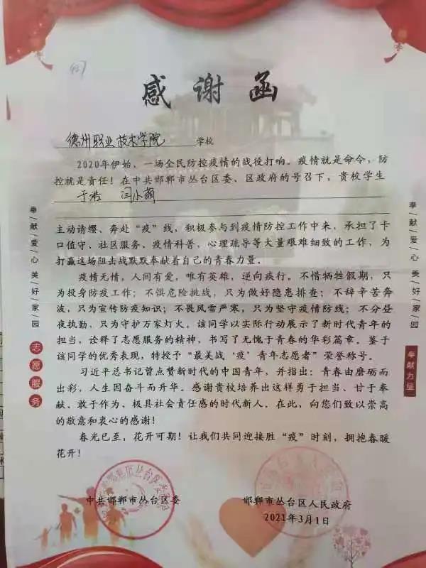 近日,河北省邯郸市丛台区委、区政府向德州职业技术学院发来一封感谢函,对我校于浩、闫小萌两位同学参与2020年丛台区疫情防控志愿服务工作,表达衷心的感谢。