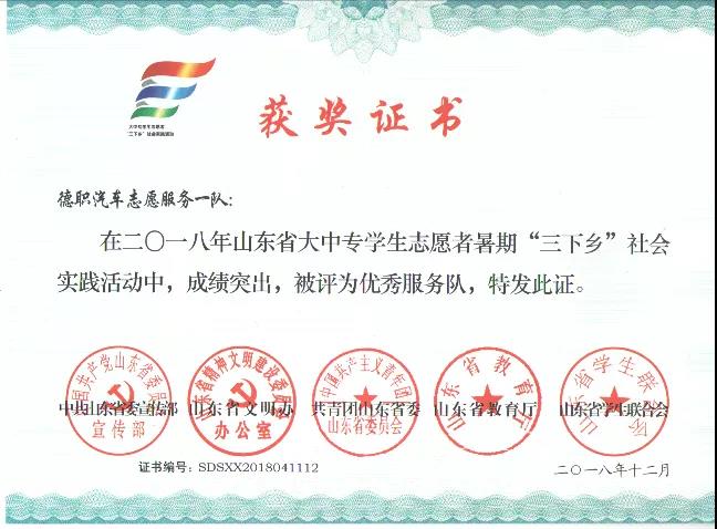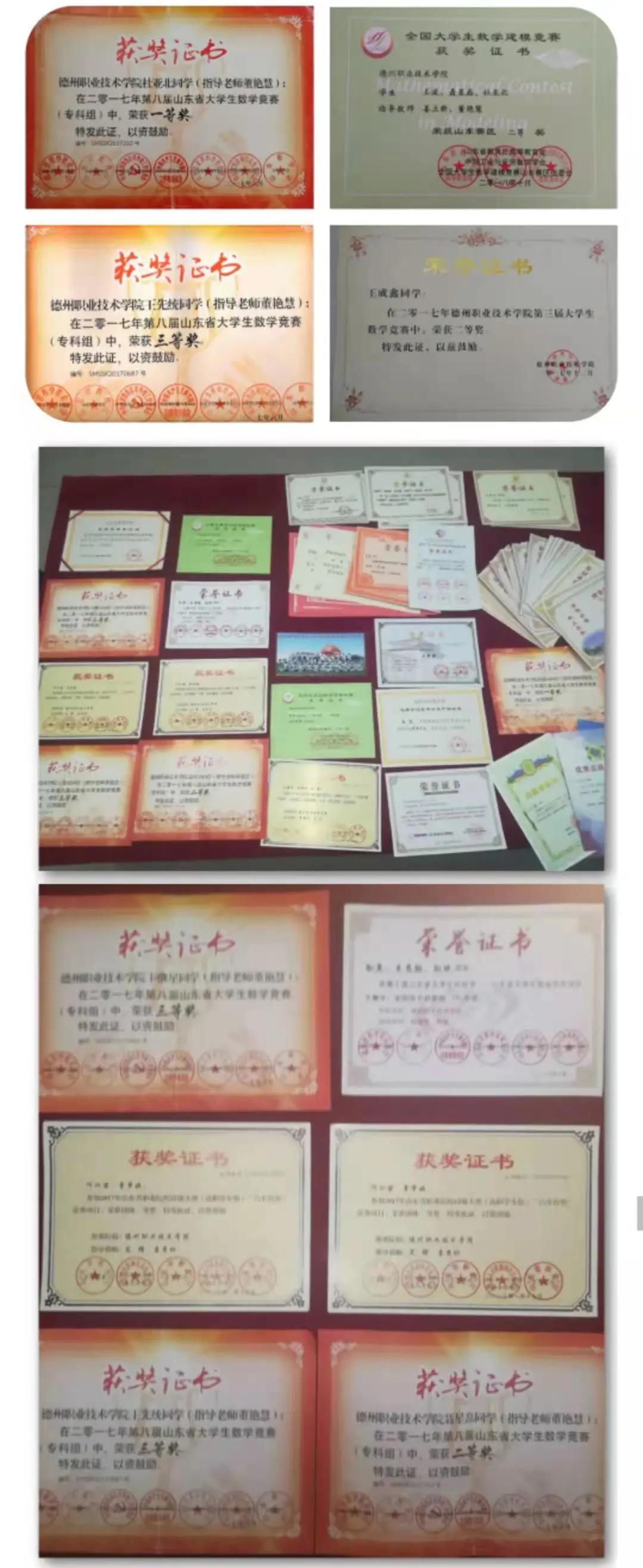 获“省级优秀班集体”荣誉称号一次,山东省“三下乡”志愿服务荣誉称号二次。专科阶段全班28人中有17名同学通过了四级的分数线,其中1名同学通过了英语六级分数线,12名同学通过了计算机二级考试,4名同学通过了计算机一级考试,2人获得山东省职业院校技能大赛“汽车营销”赛项一等奖,3人获得山东省职业院校技能大赛“汽车检测与维修”赛事二、三等奖,1人获得全国新能源汽车检测与维修大赛二等奖,7人获得全国大学生数学建模大赛山东赛区一、二、三等奖,6人获得山东省大学生高数比赛(专科组)一、二、三等奖,2人获得山东省大学生高数比赛(专科组)三等奖等奖项。另外,3人获得“山东省优秀学生干部”荣誉称号、国家奖学金、国家励志奖学金、省政府励志奖学金、校级三好学生等众多荣誉。