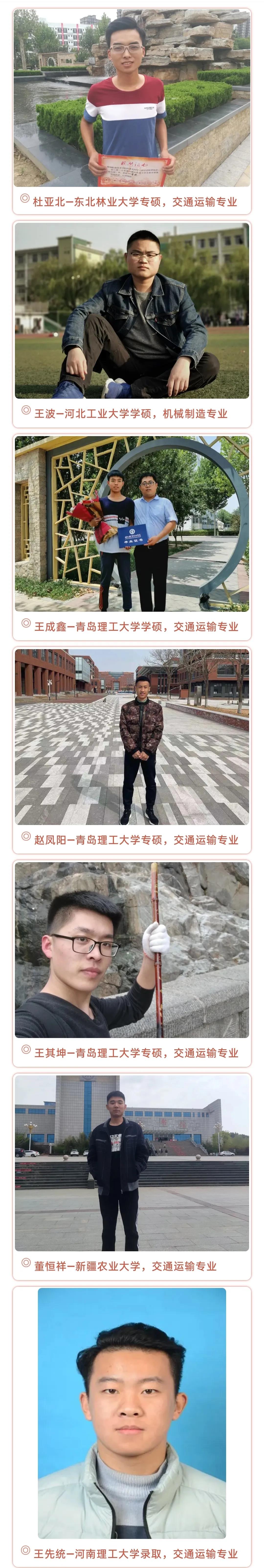 其中,杜亚北、王波凭借优异的考研成绩被两所“双一流”高校(东北林业大学和河北工业大学)录取;赵凤阳取得青岛理工大学录取专业专硕第一名的好成绩;王成鑫名列青岛理工大学录取专业学硕第二名;王其坤考取青岛理工大学录取专业专硕第四名;董恒祥被新疆农业大学录取,超过B区录取分数线90分;王先统被河南理工大学录取,其成绩超过了同期青岛理工大学本校四年制本科的学生。