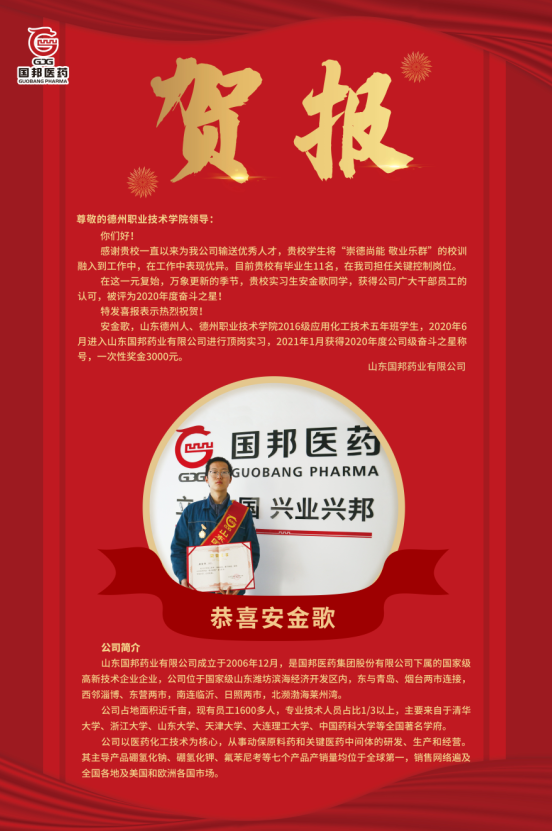 近日,山东国邦药业有限公司向德州职业技术学院发来贺报,授予我校2016级应用化工技术五年班安金歌同学2020年度公司奋斗之星称号,并颁发一次性奖金3000元。贺报还对我校一直以来为公司输送优秀人才表示感谢,对我校历届学生在企业工作中的表现给予高度评价。