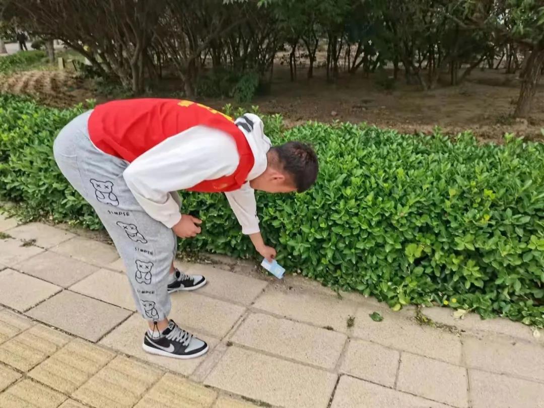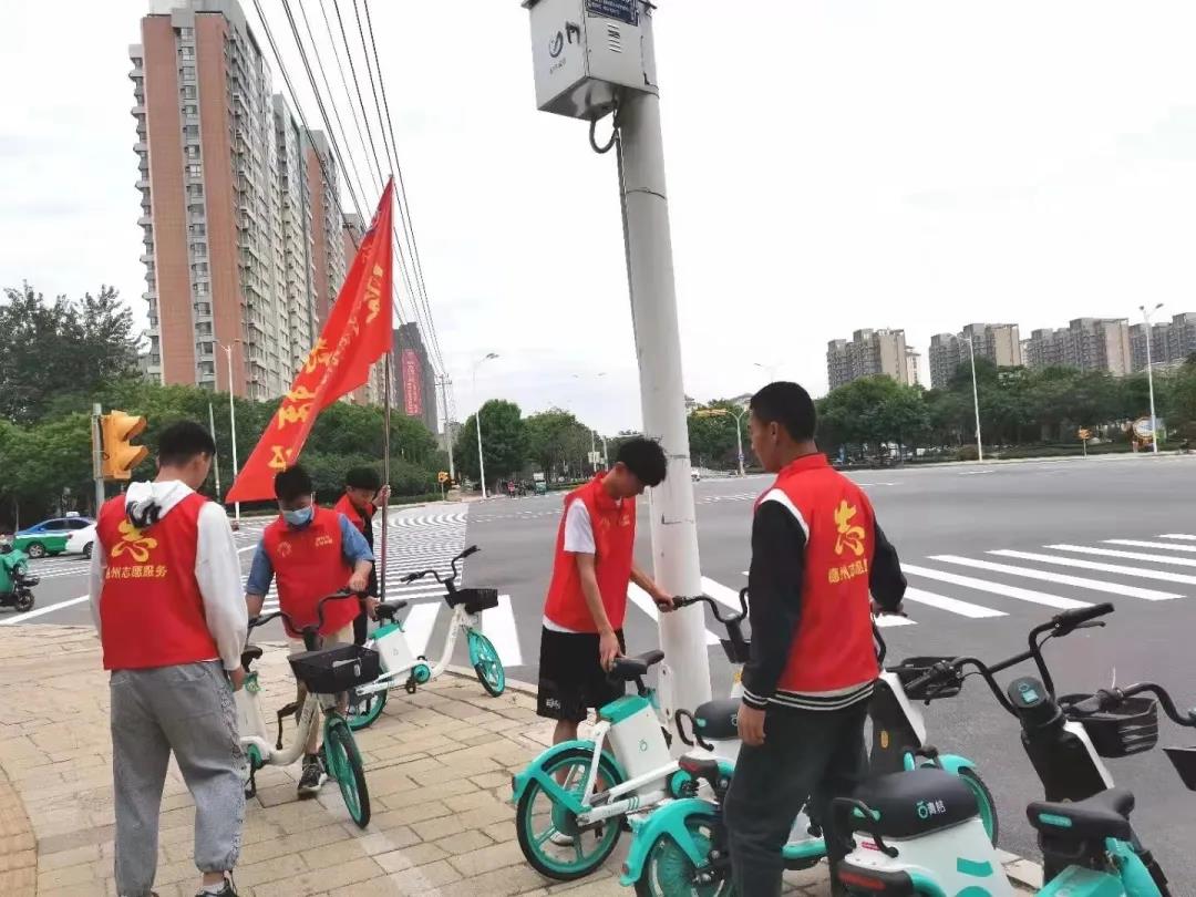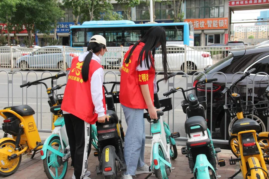 同学们分为两组,有序摆放街头的共享单车,捡拾花坛周围的纸屑、烟头等垃圾,并指挥疏导交通,提醒市民遵守交通法规。