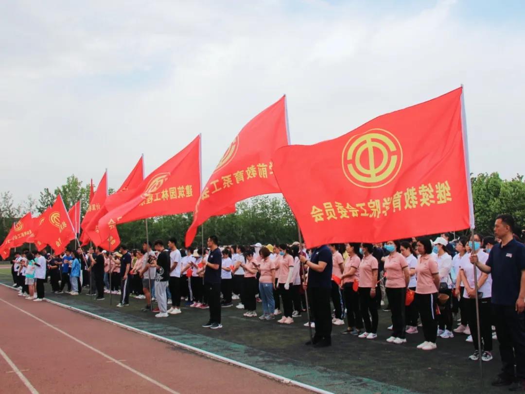 各单位工会教职工在学校田径场精神抖擞、整装待发。出发号令响起,每个组的领队喊着响亮的口号,打着鲜艳的红旗,教职工迈着矫健的步伐,唱着红色歌曲,大踏步走来。