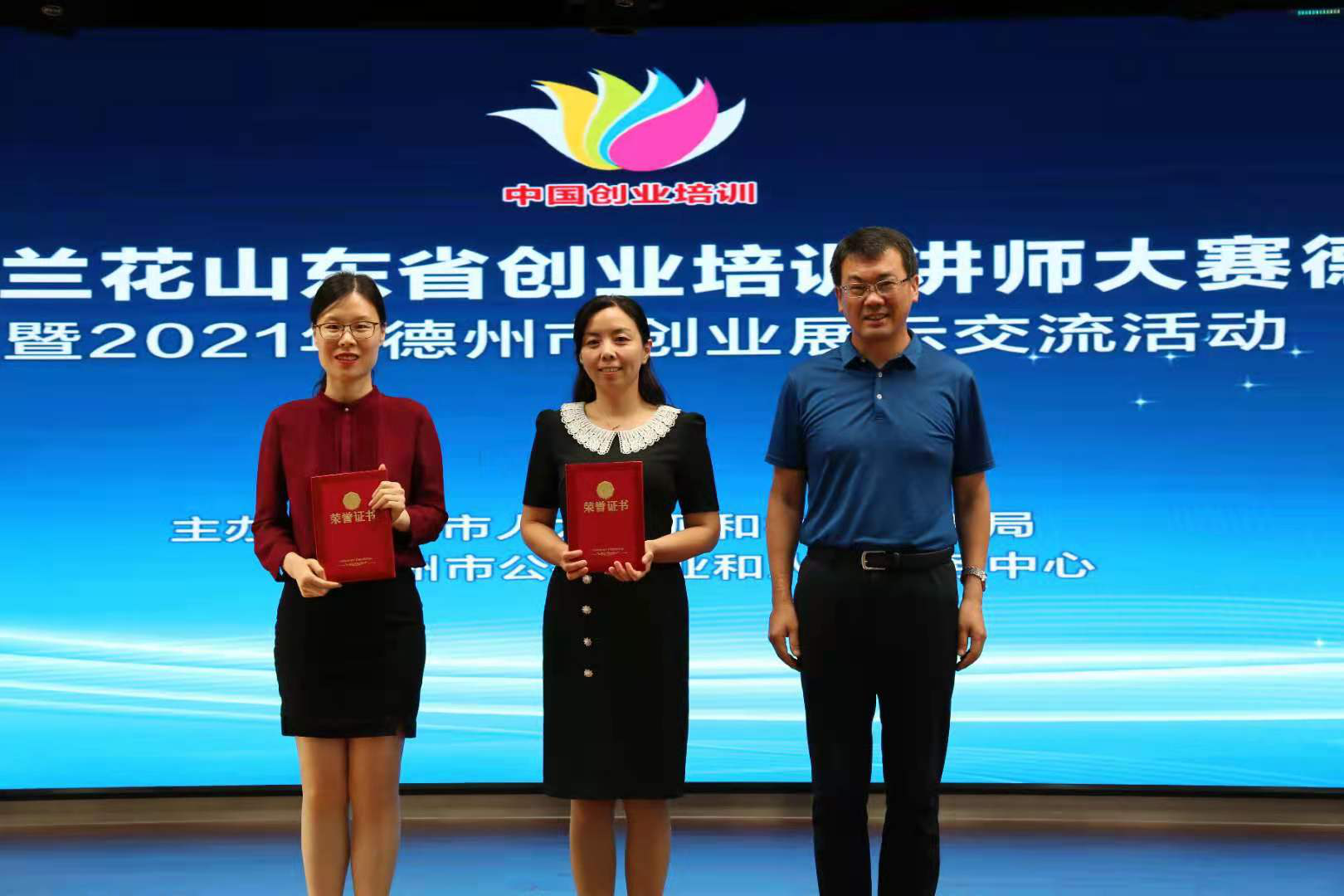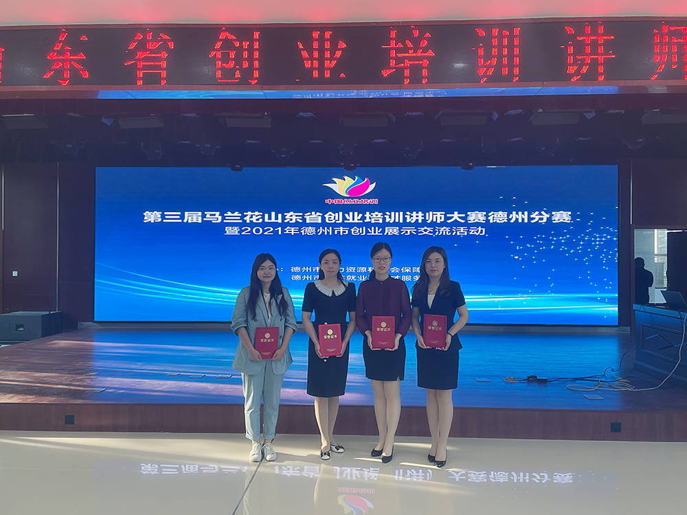 6月29日,第三届马兰花山东省创业培训讲师大赛德州分赛暨2021年德州市创业展示交流活动在市人力资源与社会保障局举行。此次活动由德州市公共就业和人才服务中心主办,主题为“创业培训•创新引领”,共有来自全市的18个优秀创业项目、17名创业培训讲师参赛。通过创业讲师笔试、创业项目展示+讲师实战能力赛、创业培训精品课展示3个环节的激烈角逐,我校教师王婧、郑艳荣获一等奖,并取得山东省创业培训讲师大赛参赛资格,教师郑新新、姜文谦分别荣获二等奖、三等奖。