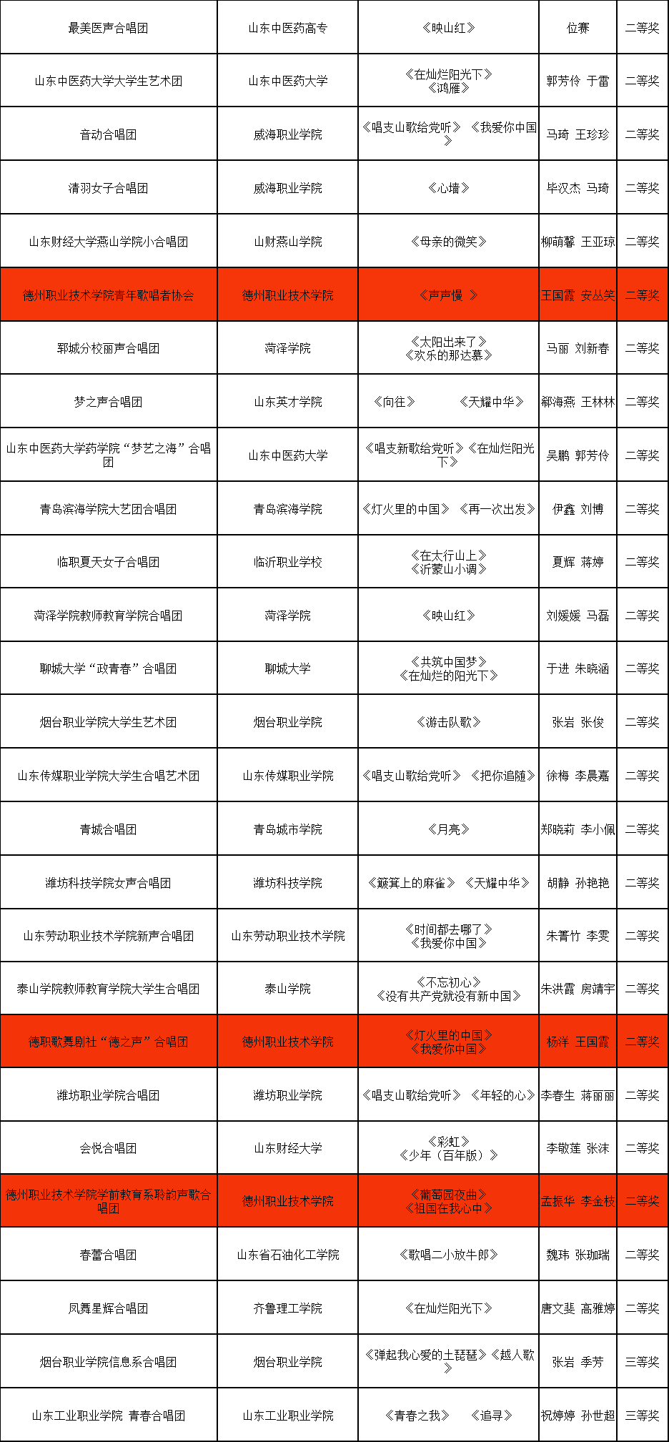 据悉,指导教师们根据合唱比赛要求,选择符合主题的歌曲。大部分学生都在课余时间加紧排练,队员们每天“打卡”训练,利用晚自习时间加训,将合唱队的重点放到了提高演唱水平和表演能力上。通过大家的不懈努力,青年歌唱者协会演唱的原创阿卡贝拉《声声慢》、德职歌舞剧社“德之声”合唱团演唱的《灯火里的中国》《我爱你中国》、学前教育系聆韵声歌合唱团演唱的《葡萄园夜曲》《祖国在我心中》均获得二等奖。