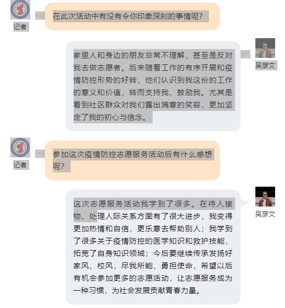 信中说,暑假期间,我校机械工程系2020级焊接技术与自动化专业吴彦文同学主动挑起重担,积极参与2021年社区疫情防控工作,在核酸检测、卡口设防、摸排走访、数据录入、网络宣传等方面,用热情周到的服务温暖人心、凝聚爱心,展现了新时代青年的责任与担当,为保障群众健康安全贡献了着青春力量。