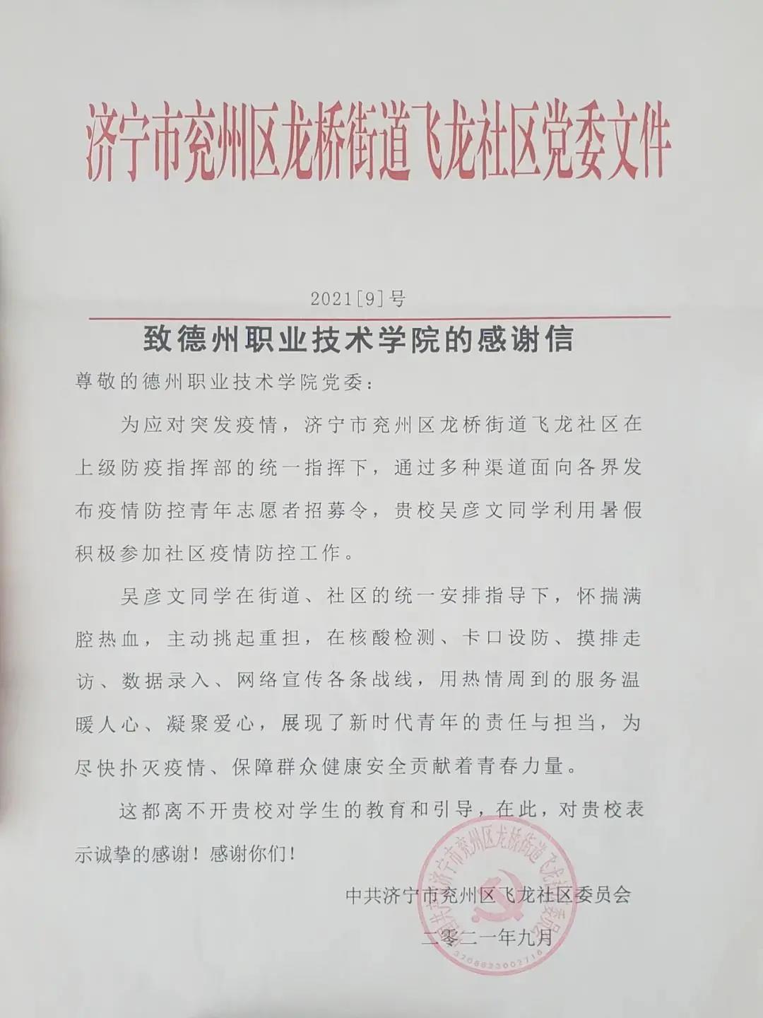 近日,济宁市兖州区龙桥街道飞龙社区委员会向德州职业技术学院发来一封感谢信。