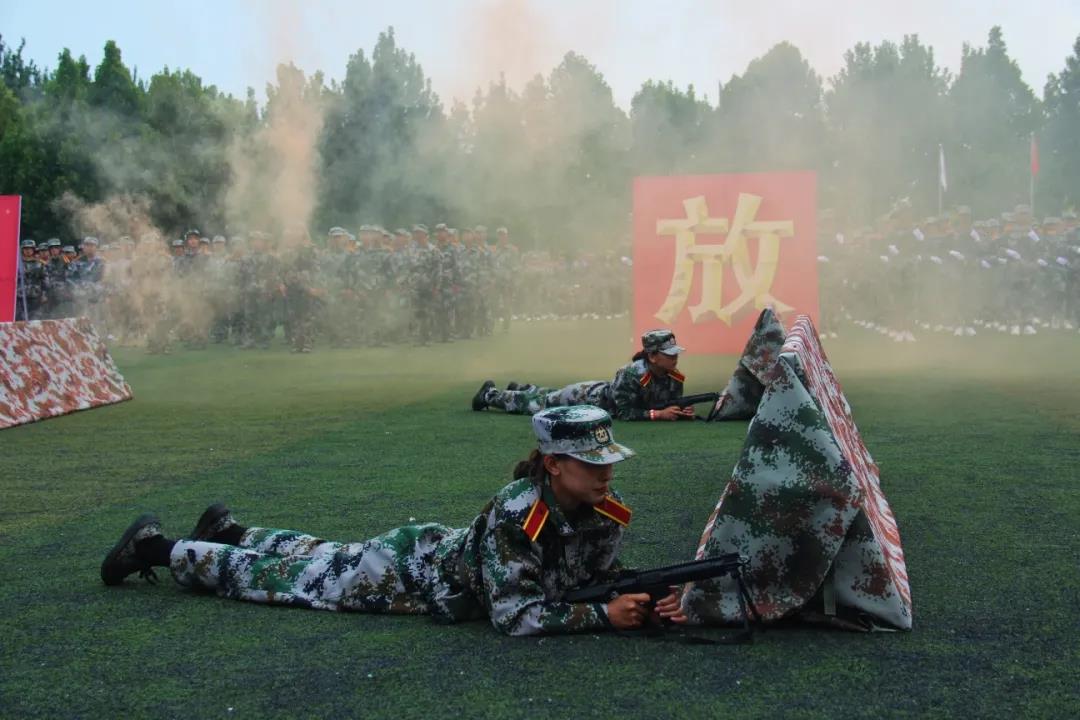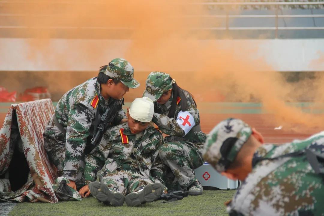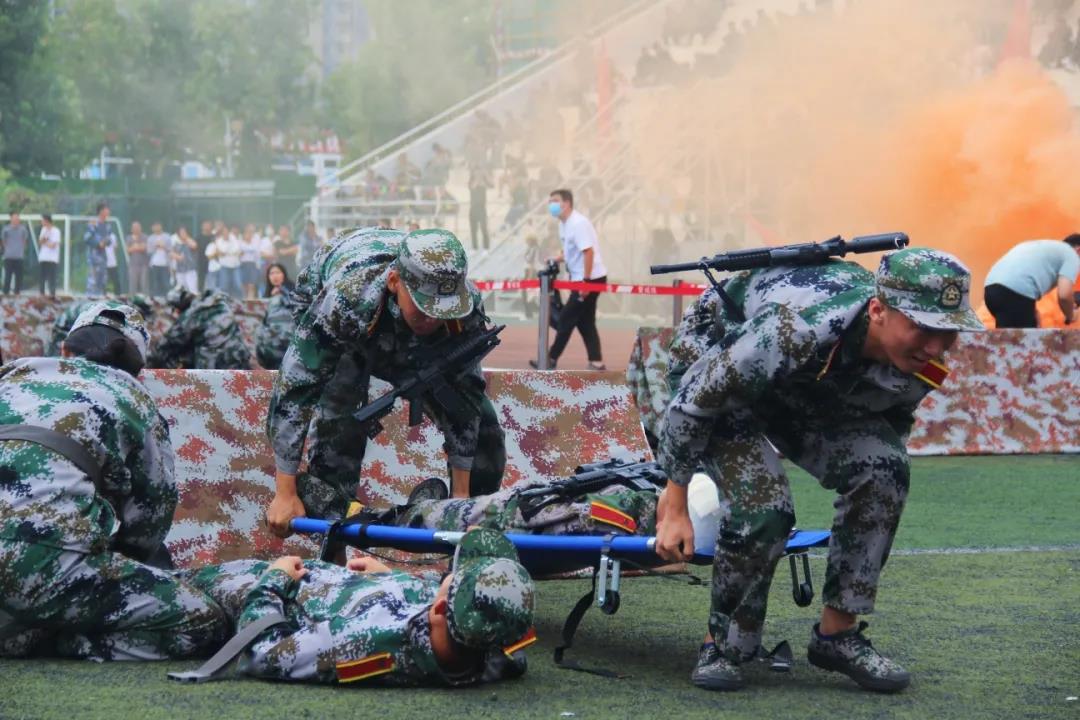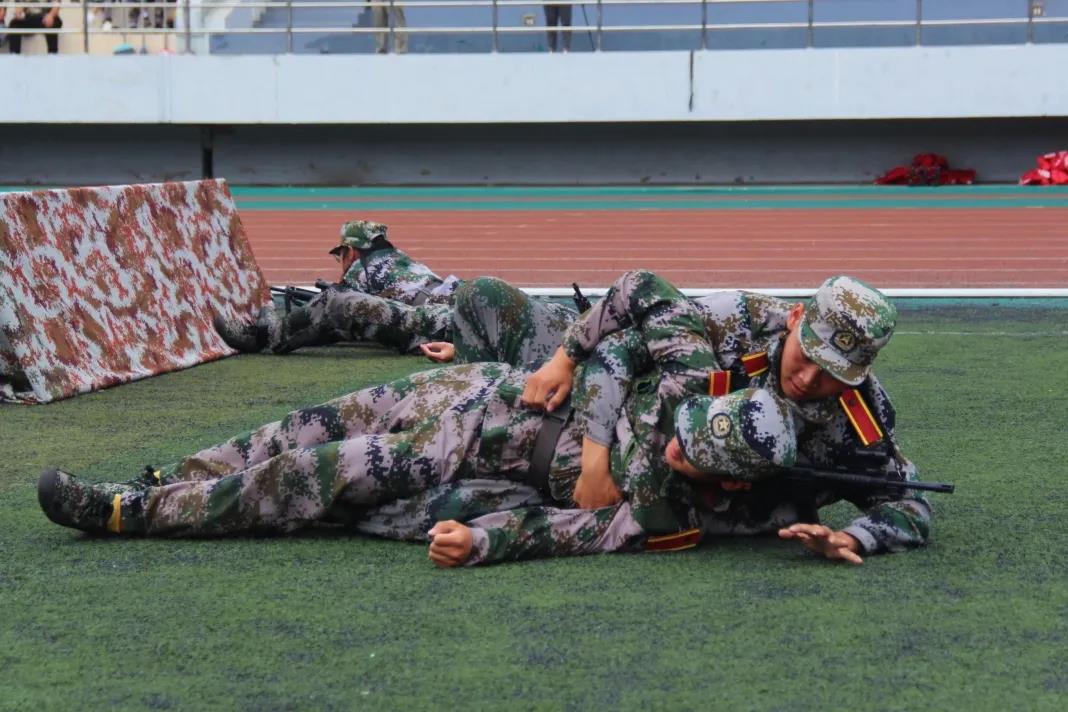 随后汇演进入到综合演练环节——“战场救护”,场上响起模拟枪炮的声音,所有人瞬间如置身真实的战场。演练新生端枪瞄准、搜索前进、医疗救护、头部包扎、腿部包扎、担架抢救,动作如行云流水一气呵成,精彩的表演赢得阵阵掌声。