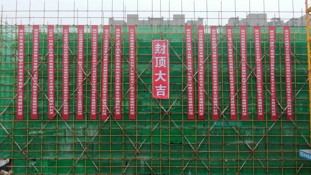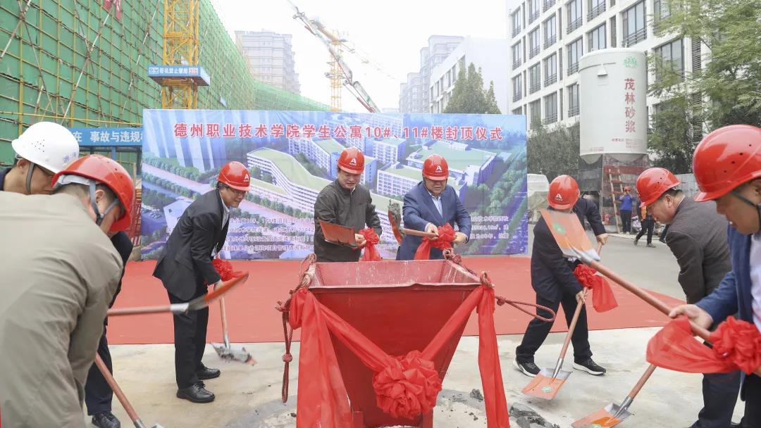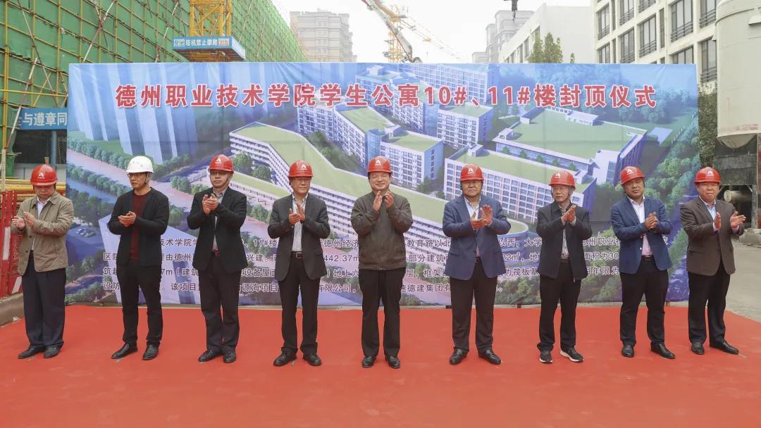 10月15日上午,由山东高速德建集团有限公司二建建设分公司承建的我校学生公寓10、11号楼工程项目顺利举行封顶仪式。德州职业技术学院党委书记樊兆杰,院长张同光,院党委委员、副院长多建民,山东高速德建集团党委副书记、总经理靳海洋,副总经理贺金清,建科股份有限公司副总经理李金林,高速德建集团二建分公司总经理张元刚等参加封顶仪式。