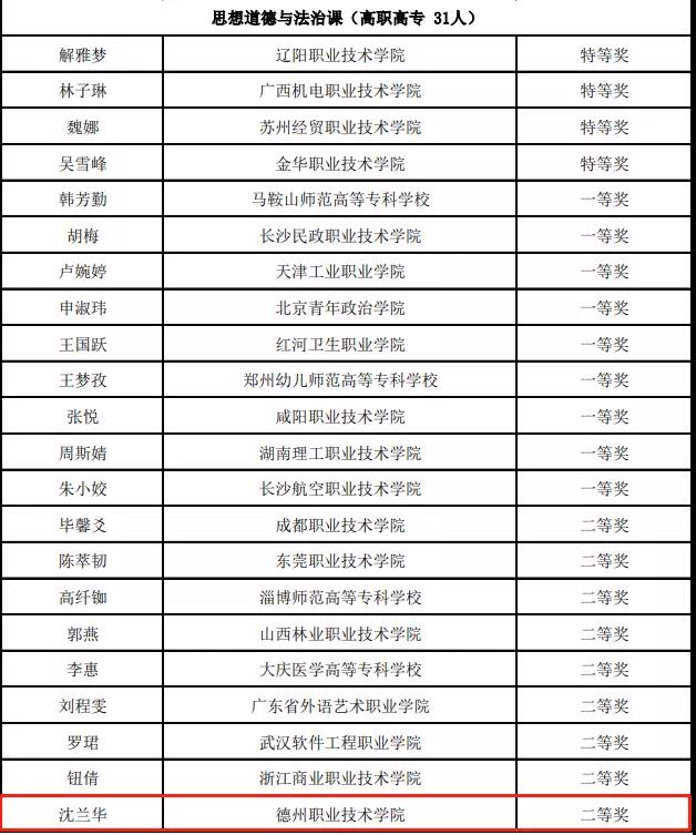 11月26日,教育部公示第二届全国高校思想政治理论课教学展示暨优秀课程观摩活动评审结果,德州职业技术学院等80所高职院校(其中,山东省有五所职业院校)榜上有名。德州职业技术学院思政课教师沈兰华获高职高专组《思想道德与法治》课二等奖。