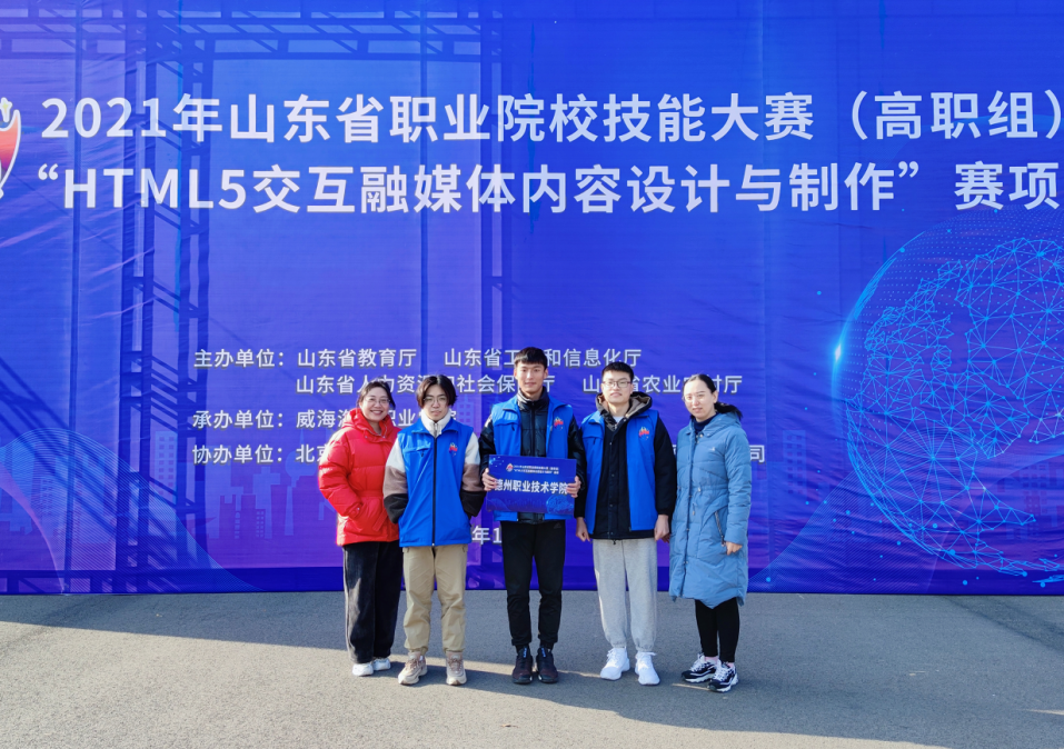 11月24日—25日,2021年山东省职业院校技能大赛“HTML5交互融媒体内容设计与制作”高职组大赛,在荣成市威海海洋职业学院举行。计算机系数字媒体教研室参赛团队在比赛中沉着应战、出色发挥,荣获一等奖的好成绩,打响了计算机系2021年技能大赛的开门红。