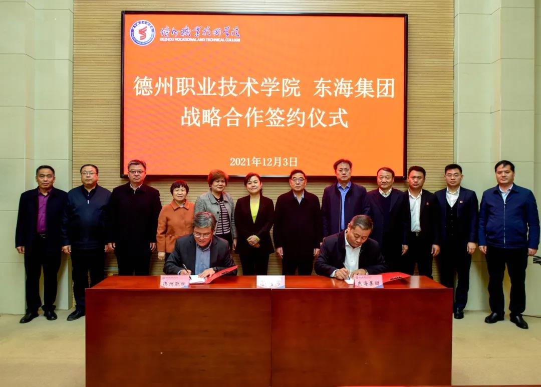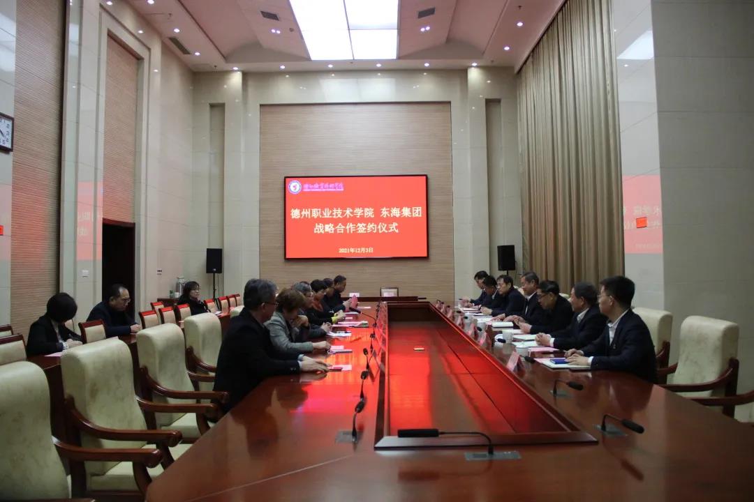 参观完毕后,双方于润德楼八楼视频会议室举行签约仪式,并就未来的合作进行了深入探讨。张同光表示,东海集团与我校专业企业合作融合度大,是紧密合作的伙伴,下一步希望与东海集团在科研项目、技能创新和产教融合育人等方面开展深入合作,打造优势平台。