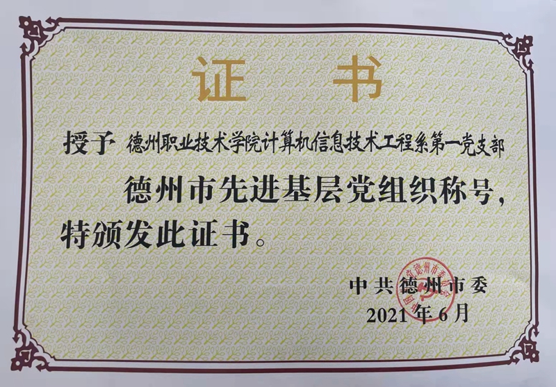 2019年3月,该支部被山东省委教育工委评为“样板支部建设单位”;2021年6月,被中共德州市委授予 “先进基层党支部”荣誉称号;2021年12月,被德州市委教育工委评为“五星级党支部”。