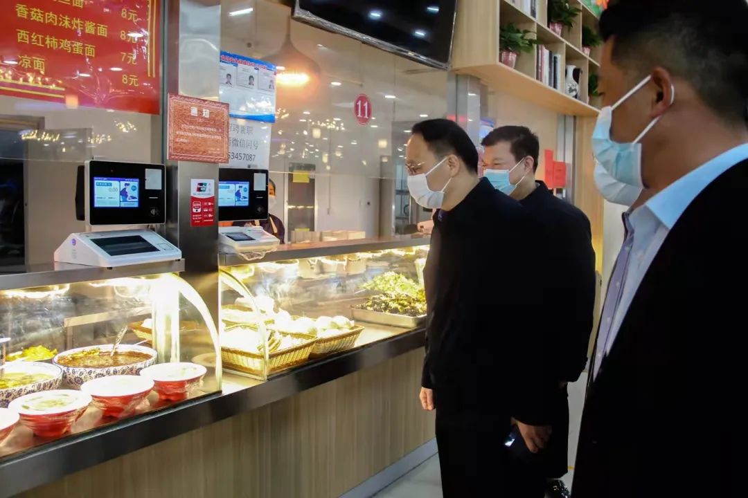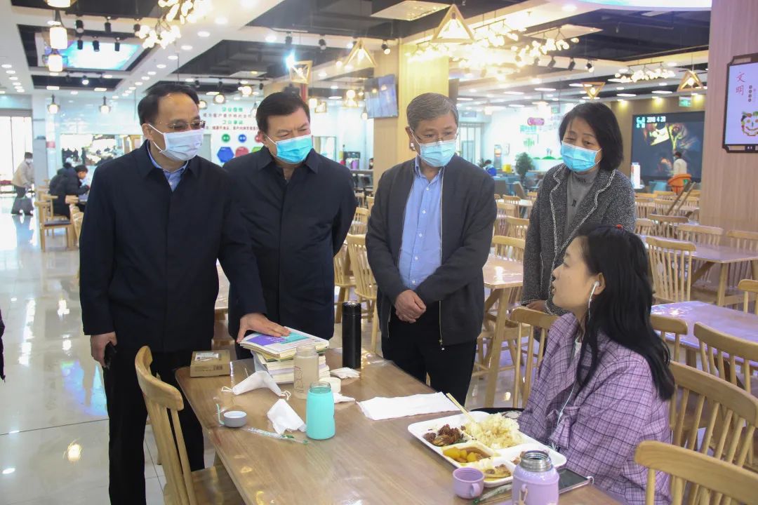 朱开国一行先后到学校大门口疫情防控留观点、规划沙盘、学生食堂等场所调研走访,听取校领导工作汇报,与师生和工作人员进行亲切交流,详细了解疫情防控和学校改革发展情况。