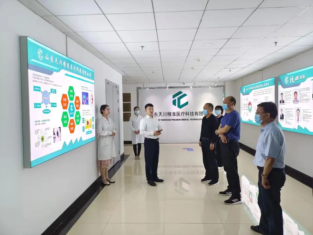 山东天川精准医疗科技有限公司总经理潘梦雨介绍公司改革发展情况,陪同郭士武一行参观企业分子生物学实验室、生物信息中心和人类遗传资源存储中心。