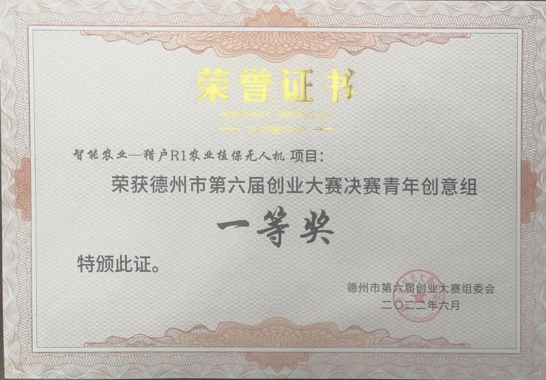 由王茂坤、李建勇、李飞,王彩月、焦雨晨组成的德州职业技术学院代表队,开发《智慧农业--猎户R1农业植保无人机》项目,经过路演、答辩、演示等一系列环节,入选决赛,获得青年创意组一等奖第一名。