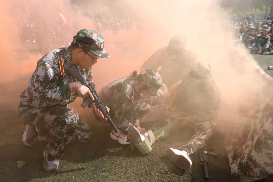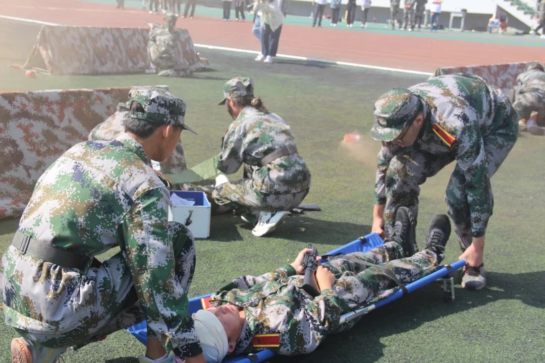 模拟战场医疗救护的硝烟下,同学们突击的身影灵活迅猛、干脆利落,气势如虹,方寸之间,将德职学子顽强拼搏、奋勇向前的精神面貌展现得淋漓尽致,赢得了现场师生的阵阵掌声。