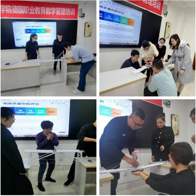 10月16日,参训学员学习学科体系与行动体系以及德国先进的职业教育教学方法——方法周。冯春军老师详细介绍了方法周开展的步骤及9大模块,并就其中的“小组工作”模块展开深入讲解,要求参培教师们通过团队合作完成项目教学——纸质桥的教学设计与制作。