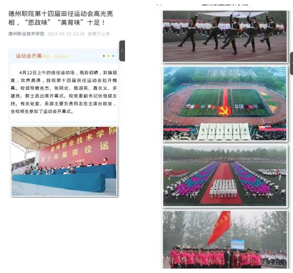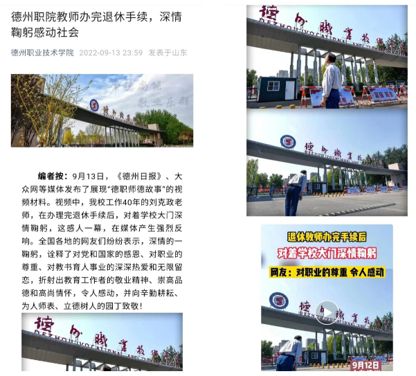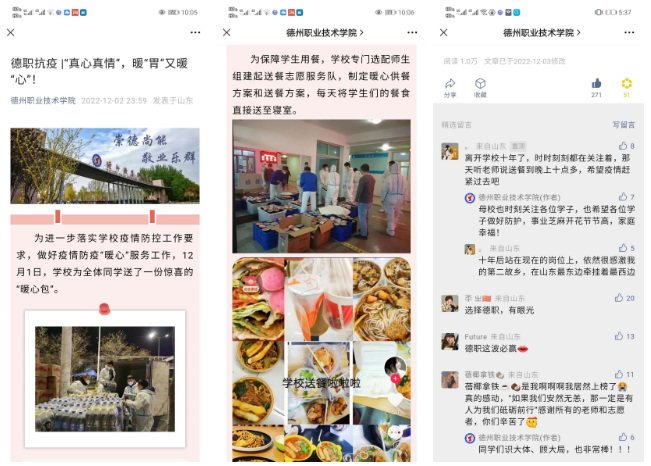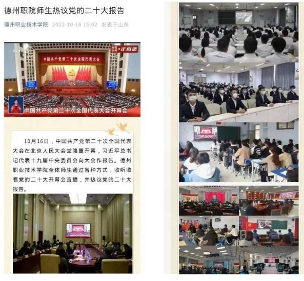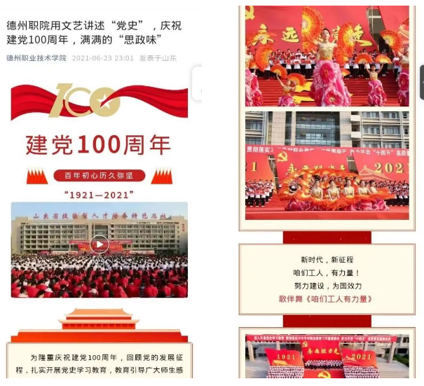 五是以探索微信平台展示规律为着力点,繁荣创意文化。落实文化“两创”要求,坚持一切微信宣传都是创意文化的理念,突出人文关怀和人文理性,根据不同节点策划不同主题,强化“思政味”“烟火味”,2022年开发了精品信息1000余篇,用心用力用情讲好“德职故事”,宣传思想工作的专业化水平、吸引力和震撼力显著提升,有力提升了学校的文化软实力。另外,在美工方面提升微信整体形象,把彰显中华优秀传统文化的儒家“德”文化和墨家“能”文化的地标性建筑——中华德能鼎、德州十大历史文化名人浮雕长廊等物质文化,彰显“一训三风”的精神文化照片作为微信推文的重要内容,微信帖子图文并茂、美观大方。