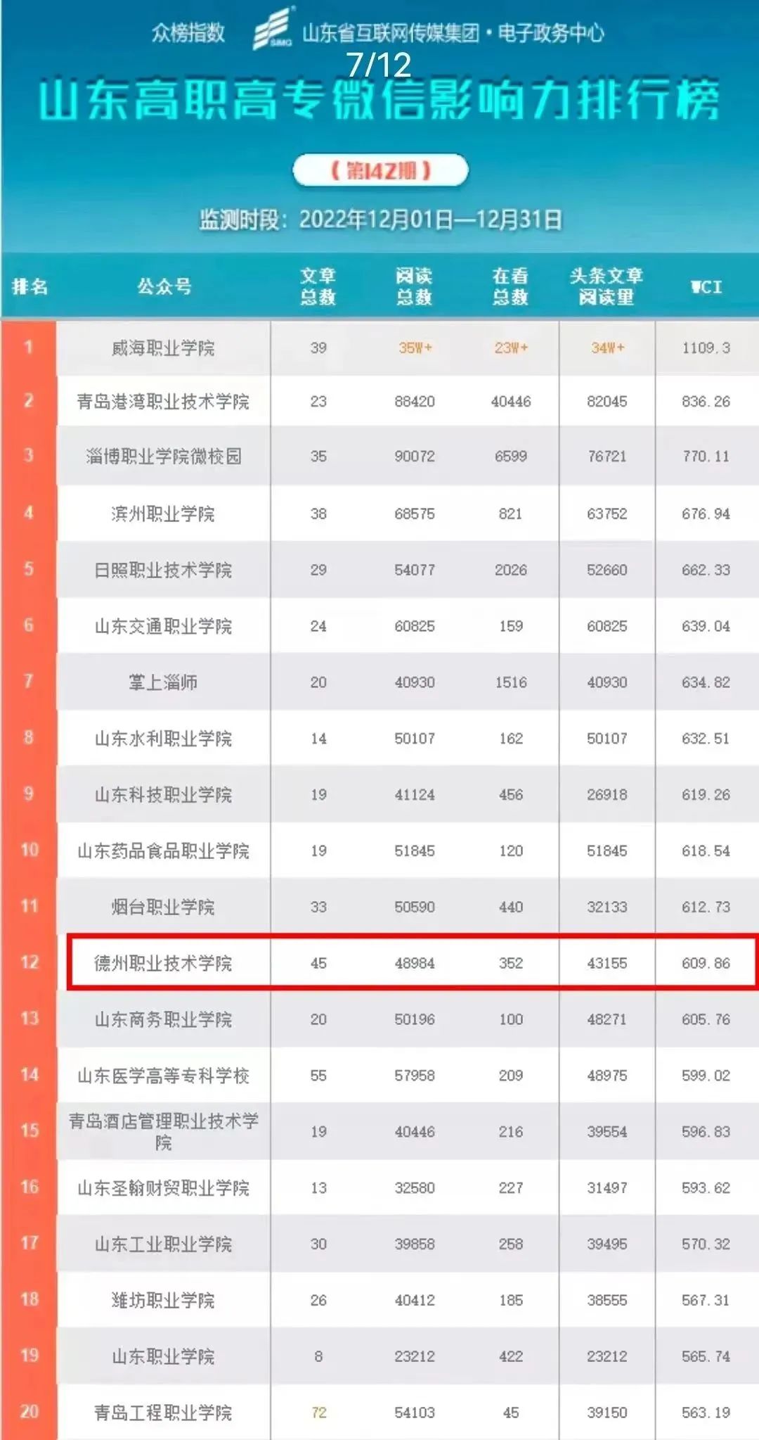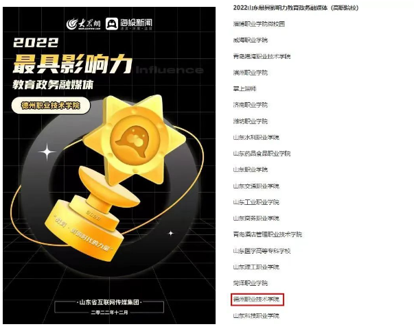 1月7日,山东省教育厅官方微信平台——山东教育发布”公布山东省教育系统官方微信公众号2022年12月影响力榜单,德州职业技术学院微信公众号影响力在全省80所高职院校中位居第12位,稳居全省一流方阵。