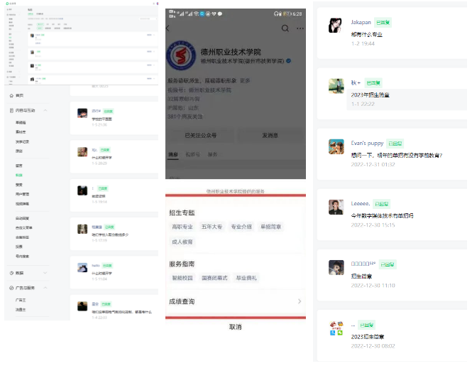 六是以微信平台为服务窗口,帮助师生解决急难愁盼问题。发挥微信平台后台强大功能,微信平台运营团队24小时值班,密切关注微信后台留言信息,运营团队不能解决的转发相关部门提出办理意见,帮助师生解决了大量学习、生活、招生、考试、缴费和升学等问题。