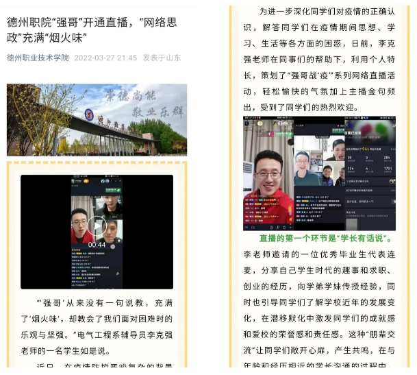 四是以微信平台为纽带,推进宣传育人以微信平台整合打造高素质宣传队伍,组建网管员、舆情信息员、大学生传媒中心等专业化的宣传团队,与德州日报共建大学生记者团,组建德州网络直播中心。宣传队伍秉持“地球不爆炸,我们不放假”的观念,不断掌握新知识、熟悉新领域、开拓新视野,增强本领能力,加强调查研究,不断增强脚力、眼力、脑力、笔力,成长为一支政治过硬、本领高强、求实创新、能打胜仗的微信宣传思想工作队伍。