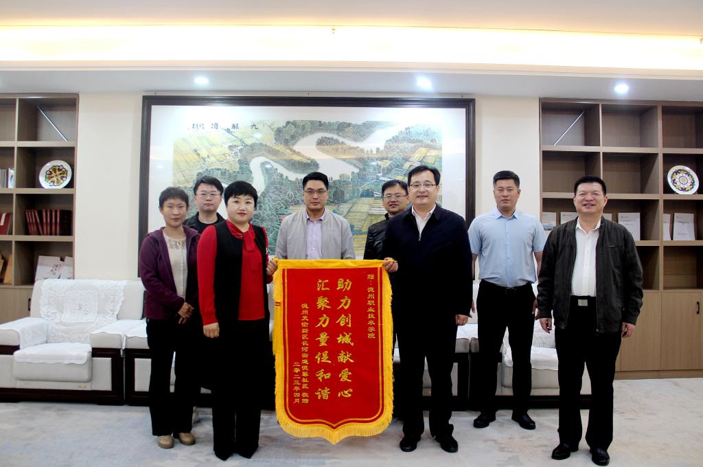 5月8日上午,德州天衢新区长河街道德馨社区党委书记赵心美一行四人来我校赠送锦旗,向全体师生对社区的帮助和支持表示衷心感谢和敬意。校党委书记樊兆杰热情接待赵心美一行,校党委委员、办公室主任、宣传部部长朱弘代表学校接受锦旗。宣传部、团委等相关同志参加活动。