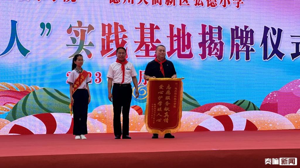 魏洪春向我校赠送锦旗,对我校开展的“资助育人—学雷锋·爱心护学”志愿活动表示认可与感谢,希望继续加强合作,弘扬志愿服务精神,引领区域文明风尚。杨俊革为我校“资助育人—学雷锋·爱心护学”优秀志愿者代表赵延通、孔祥婷等人颁发荣誉证书。刘宏杰与李欣共同为德州职业技术学院“资助育人”实践基地揭牌。