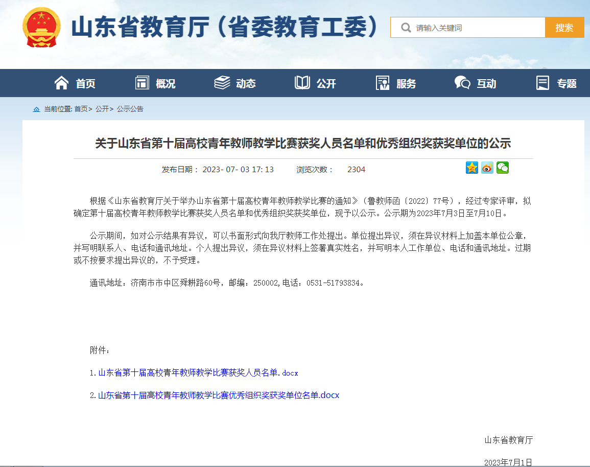 7月3日,山东省教育厅公布第十届高校青年教师教学比赛获奖人员名单。德州职业技术学院青年教师邓婷、孙瑞荣获二等奖和三等奖,宋阳、王婷婷老师获得优秀奖。