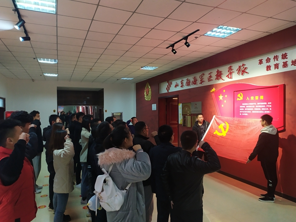 步入山东渤海军区教导旅革命传统教育基地后,全体党员首先在鲜红的党旗下重温入党誓词,牢记入党初心。接着,在讲解员的指引下,大家依次参观了“渤海建军 守卫家园”“战旗西指 铁血万里”“铸剑为犁 屯垦戍边”“英载史册 精神不朽”四个部分。党员们通过观看音像资料片、革命历史图片和VR体验等形式,了解革命先烈的英雄事迹,深刻感悟一代代教导旅战士为实现“初心”矢志不渝、砥砺前行的英雄壮举。