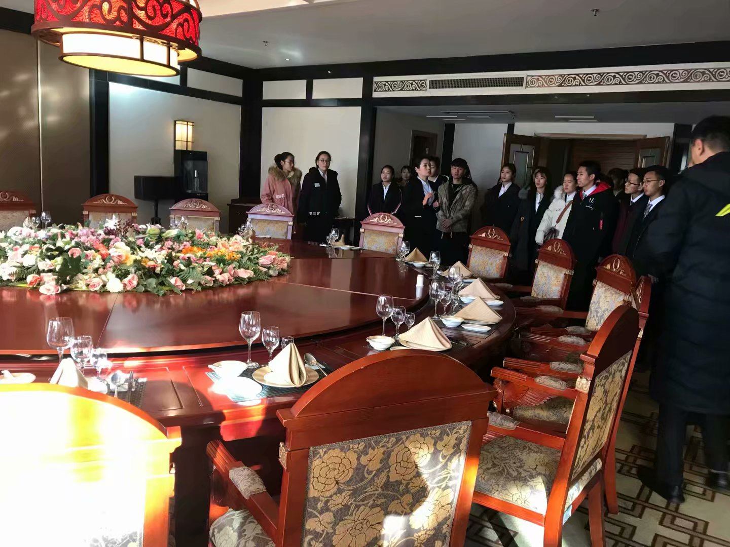 酒店人力资源部经理刘真真首先向同学们介绍了酒店的发展和企业文化,绿色环保主题酒店的理念一下子吸引了学生的注意力。接着酒店西餐部经理刘峥和中餐部经理刘焕新带领同学们参观了大型宴会厅、中餐厅、西餐厅、康乐部等场所。豪华宽敞的宴会厅、精致大气的中餐厅、典雅舒适的西餐厅,规范的摆台、整洁的餐具、营养丰富的菜品无一不给学生留下深刻的印象。同学们还参观了酒店前厅部、客房部、多功能会议室、布草间等,让同学们充分了解客房清洁工作的规范性和酒店强烈的优质服务意识。同学们一边细心聆听讲解,一边拍照记录,更有的现场就地学习,把自己当成酒店的工作人员为大家开门、引领。