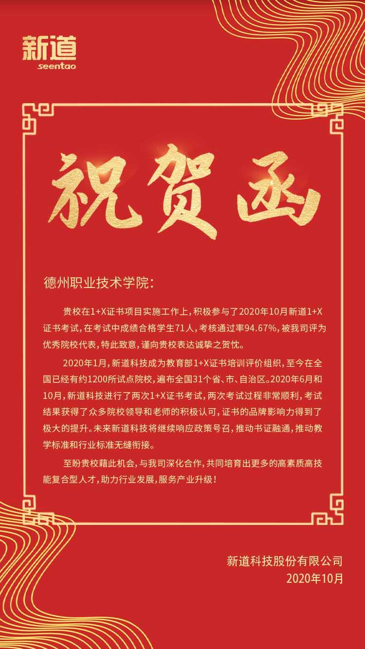 10月27日,“1+X财务数字化应用职业技能等级证书”评价机构新道科技股份有限公司向我校发来祝贺函,祝贺我校在1+X证书项目实施工作上成效显著,被评为优秀学校代表。
