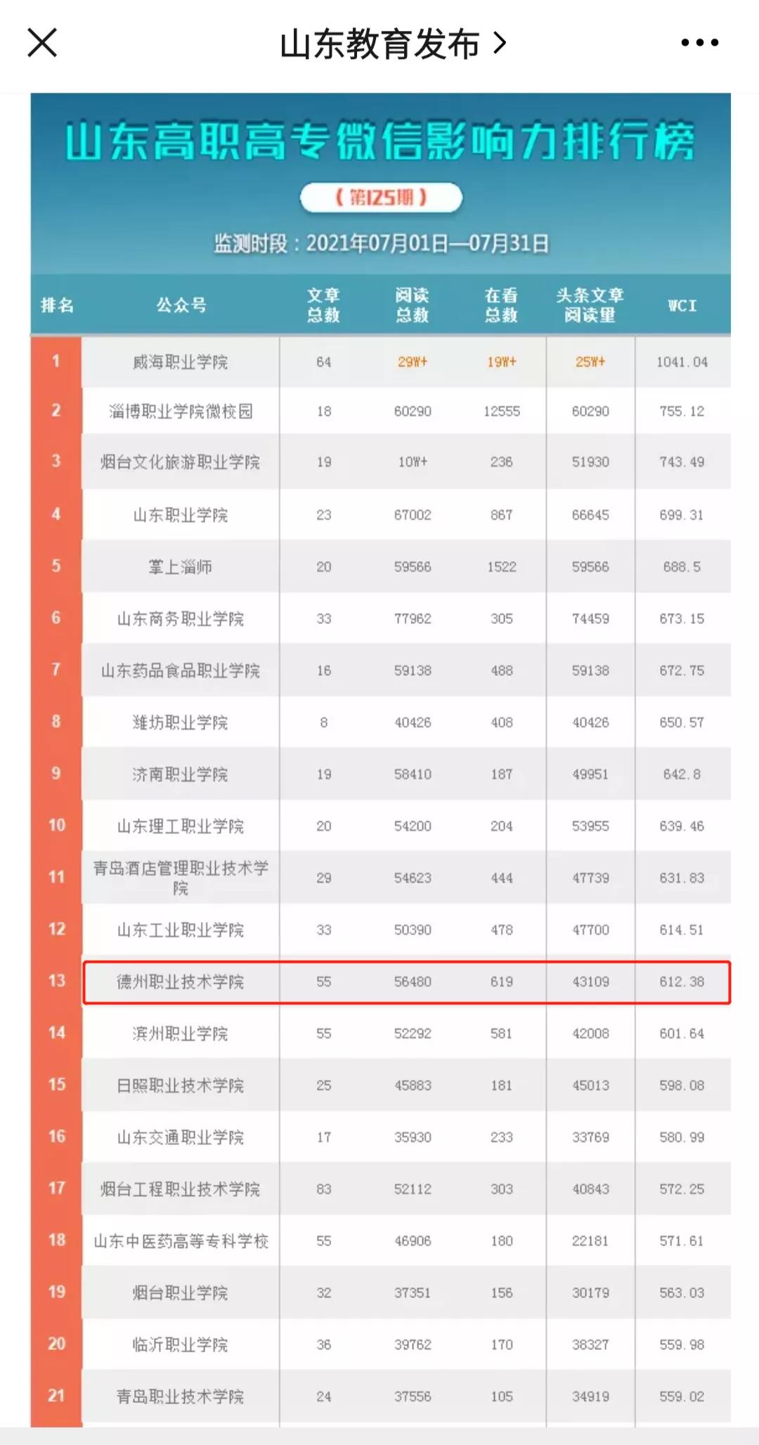 根据省教育厅官微统计,7月份,我校微信公众平台影响力,在全省80所高职院校中位居第13位,继续保持先进水平!