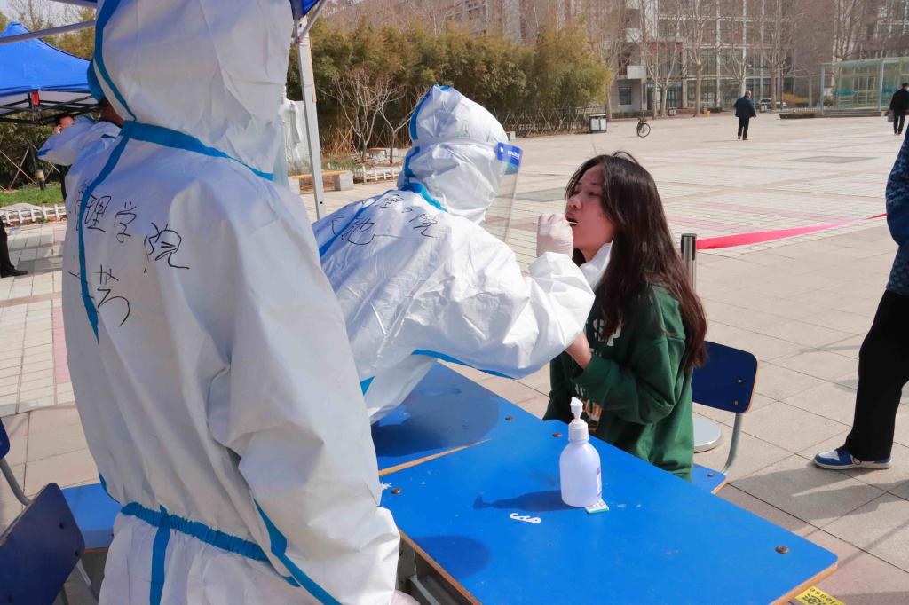 为保障学校每天的抽检任务按时完成,健康管理学院有护理资质的6名大学生主动请缨,穿上隔离服化身“大白”,与医务人员一起,战斗在核酸检测第一线。他们每天中午12点来到现场,整理抽检用具,和“红袖章”一起提醒每一位前来做核酸检测的师生佩戴好口罩,出示预约码,保持一米间隔,并提前扫码,有序完成采样,保障了核酸采样工作顺利进行。志愿者们利用自己的专业知识,帮助同学们讲解做核酸要领,并给出建议和预防常识,帮助同学们提高健康知识水平和防疫能力。